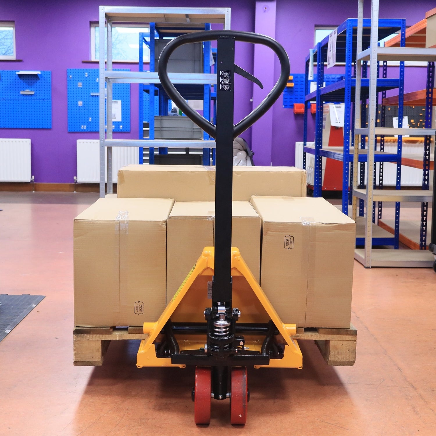 Handle heavy loads with confidence using RackZone.ie's Heavy-Duty Pallet Truck with PU Wheels - engineered for reliable performance, quiet operation, and excellent maneuverability in busy environments.